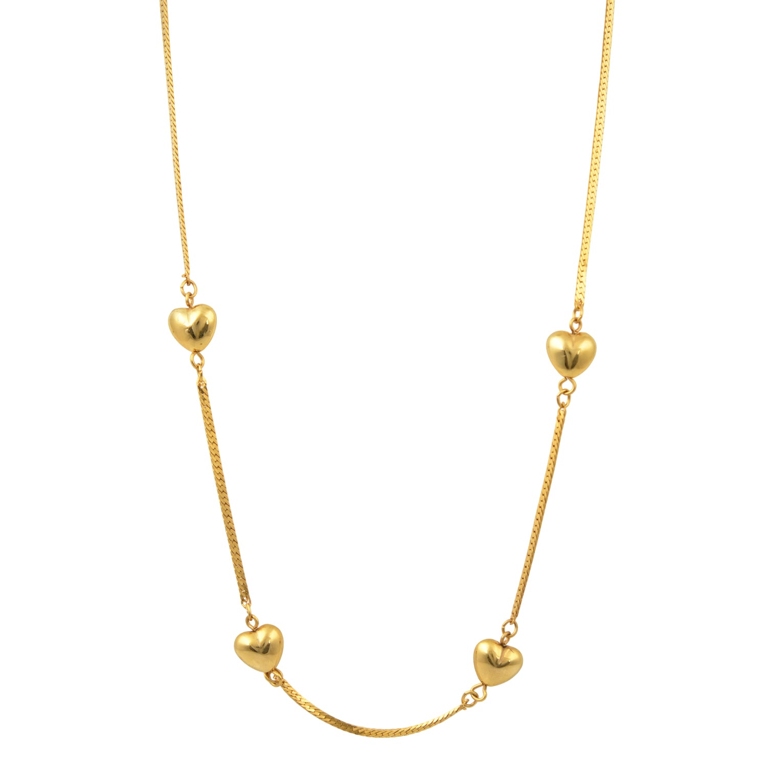 This long, versatile chain features a subtle mixed-media design, alternating between a fine, sleek link and sections of delicate, woven texture. Suspended along the chain's length are several beautifully rendered puffed gold hearts. These dimensional accents give the necklace a rich, textural presence and a romantic, carefree swing.