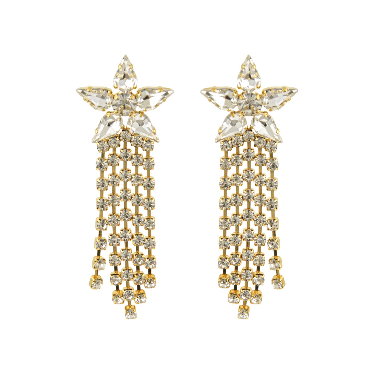 The earring begins with a radiant five-point star stud, meticulously crafted with a cluster of multifaceted, clear crystals. Below this celestial base, a brilliant waterfall of crystal chains cascades down, creating a breathtaking fringed effect. Each chain is set with continuous shimmering stones, ensuring the earrings catch and reflect light with spectacular, dazzling movement.